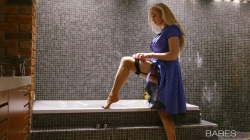 Через некоторое время девушка уснула, парень решил пойти домой. Но, выходя он наткнулся, на провокационно открытую дверь в ванной комнате, откуда доносился шум воды. Он понимал, что в доме кроме его девушки и её мамы никого нет, тут его любопытство взяло над ним верх, он тихо подошёл к двери и стал подглядывать. Он видел, как раздевается сексуальная мамаша его девушки, обнажая свои красивые и пышные формы. Спустя несколько минут мамочка увидела, что за ней подглядывают, и позвала парня к себе поближе. Недолго думая, наглая мамаша соблазнила и занялась сексом с парнем дочери прямо в ванной под шум воды. Парень сразу же принялся делать куни этой сексуальной блонде, но длилось это недолго. В ванную зашла её дочь и обнаружив своего парня, который пытался спрятаться устроила скандал. Но, уверен это не последняя попытка мамочки отбить парня у дочери, очевидно, что парень ей понравился и она захочет продолжения. |
